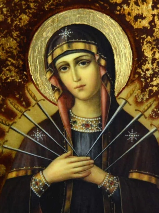 Икона Божией Матери «Семистрельная» отображает евангельское повествование о том, как Дева Мария с Иосифом Обручником принесли в Иерусалимский храм Младенца Христа на 40-й день после Его рождения. Присутствующий в храме святой старец Симеон Богоприимец по внушению Духа Святого увидел в Богомладенце ожидаемого всем израильским народом Мессию, Искупителя. Предвидя скорбь, которую придется перенести Божией Матери при распятии Христа, праведный Симеон обратился к Ней со словами: Се лежит Сей на падение и на восстание многих в Израиле и в предмет пререканий, – и Тебе Самой оружие пройдет душу… (Лк. 2, 34–35).